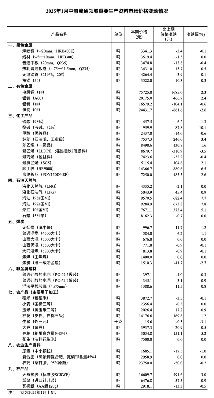 国家统计局1月24日消息,据对全国流通领域9大类50种重要生产资料市场价格的监测显示,2025年1月中旬与1月上旬相比,23种产品价格上涨,19种下降,8种持平。其中,生猪(外三元)价格环比下降3.1%。